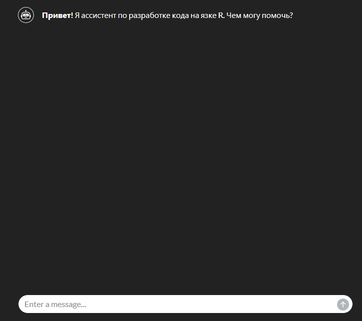 shinyApp(ui, server)Данный интерфейс имеет тёмную тему, и окно ввода запроса всегда располагается в нижней части окна: