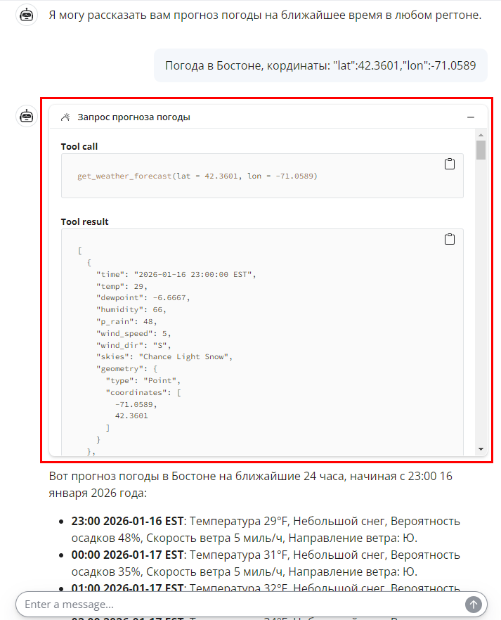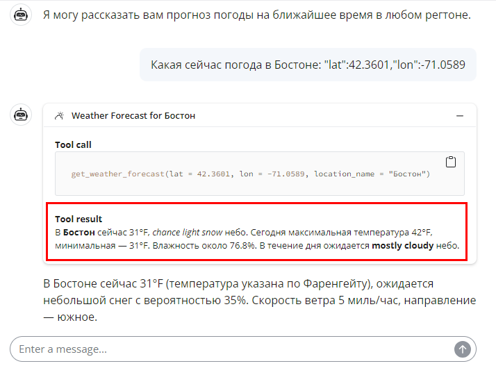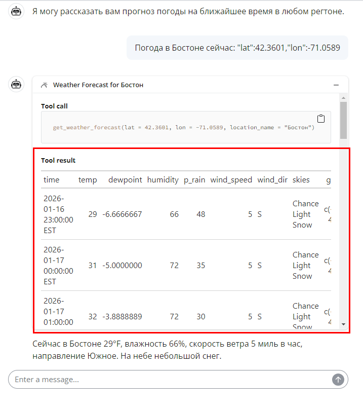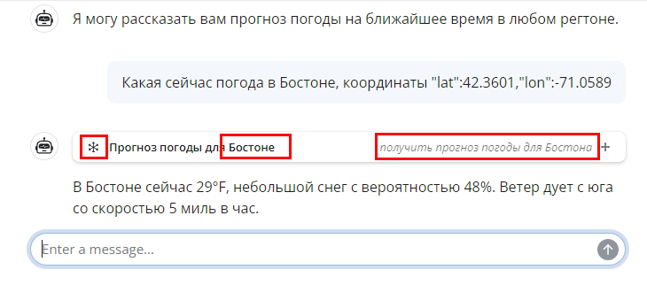 Теперь иконка вызываемого инструмента меняется в зависимости от текущей погоды, в описании указывается название населённого пункта, а в правой части описания отдельно указана причина, по которой модель решила вызвать этот инструмент. Добавление этого описания реализовано через специальный аргумент _intent, который вам надо добавить в функцию вызываемую инструментом, и в аннотации с описанием аргументов указать, что модель должна указывать в жтом аргументе причину вызова инструмента.