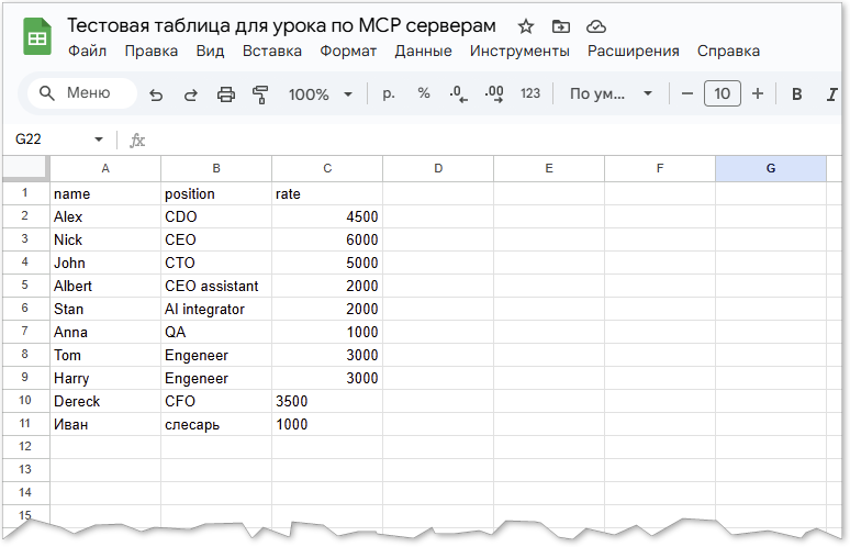 В этом разделе мы будем работать с Google таблицами, я заранее создал демо таблицу и расшарил доступ на сервисный аккаунт, который использую в своём MCP клиенте.
