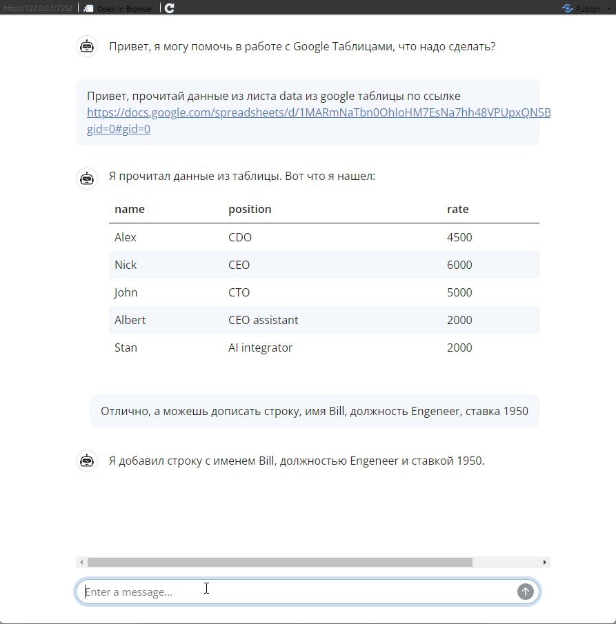 chat$chat("А теперь запиши в эту же таблицу новую строку, имя Erik, должность CFO, оклад 4250")Т.е. в этом примере мы: