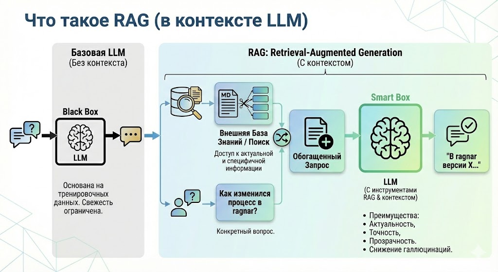 В предыдущей главе мы научили нашего ассистента пользоваться внешними инструментами через MCP. Но что делать, если задача требует не выполнения функции, а глубокого знания специфической документации? Надеяться на общую эрудицию LLM опасно — она может “галлюцинировать” или просто не знать о существовании ваших внутренних регламентов и свежих учебников.