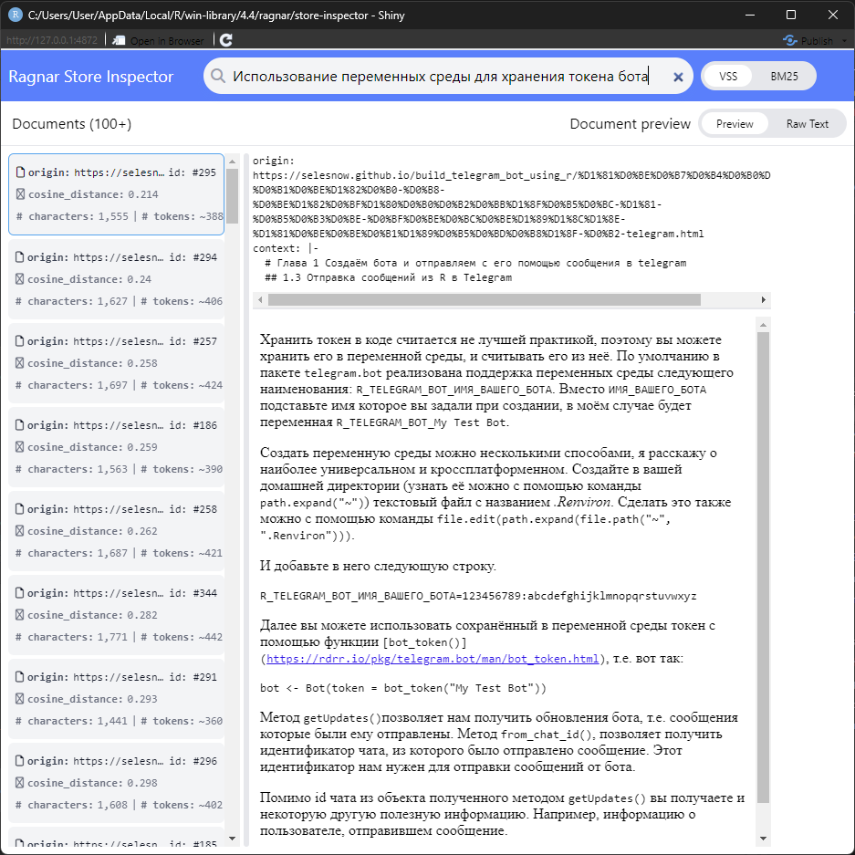 В ragnar отдельно встроен функционал Ragnar Store Inspector, запустить его можно с помощью ragnar_store_inspect(store). С его помощью вы можете выполнять через графический интерфейс поиск по вашему хранилищу, это поможет вам определиться с тем, успешно вы разбили ваш исходный документ на чанки, или нет.