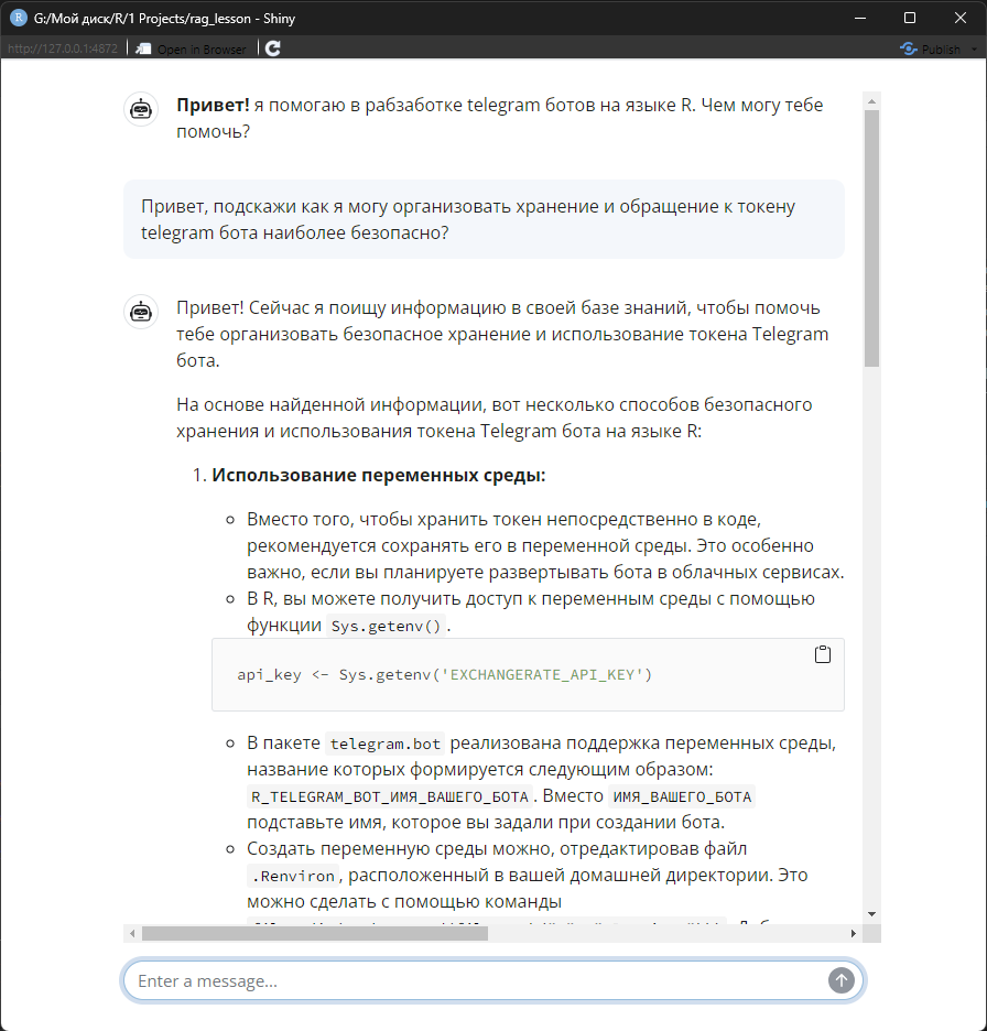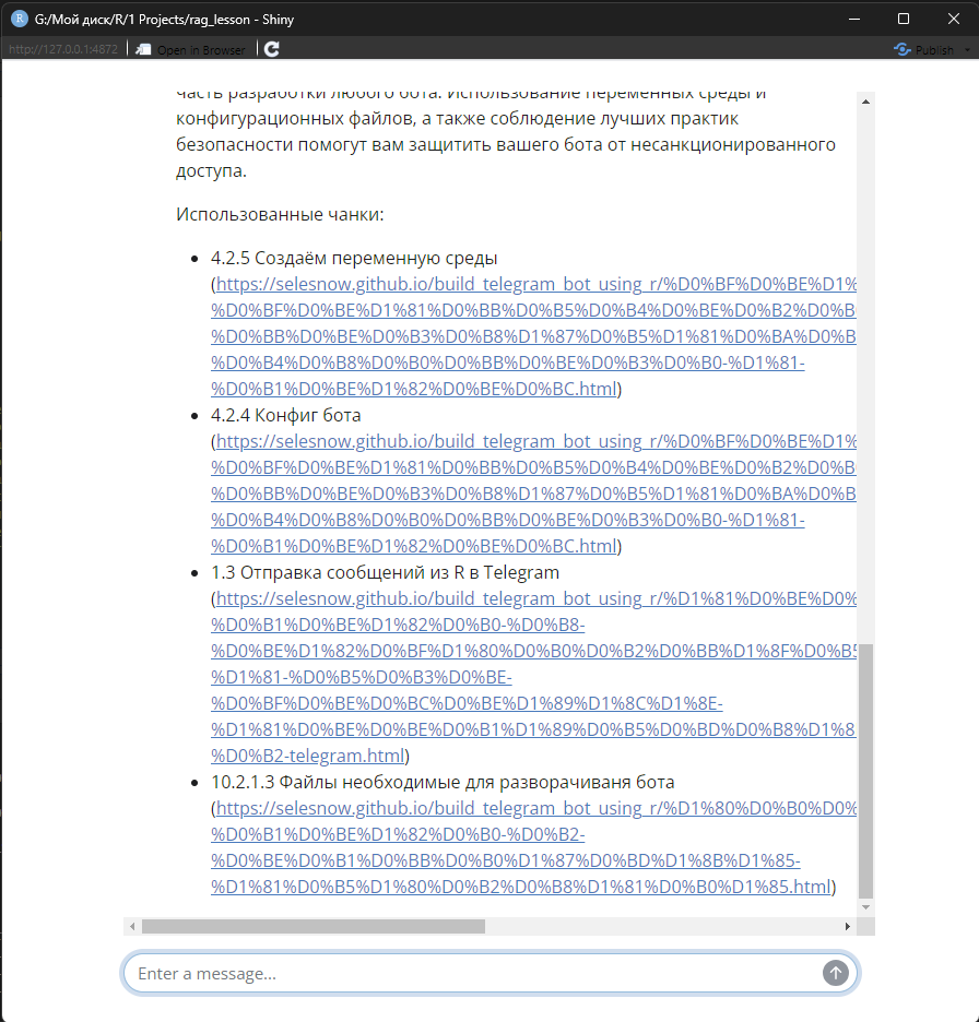 shinyApp(ui, server)Подключение модели к базе знаний реализуется там же где и инициализация чата, т.е. в серверной части приложения, там же вы добавляете в объект chat инструмент get_data_from_knowledge_store, позволяющей модели осуществлять поиск по вашей базе знаний.