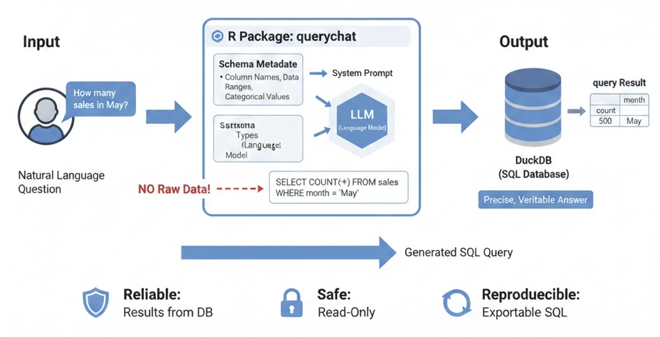 Такая архитектура делает querychat надежным, безопасным и воспроизводимым инструментом: